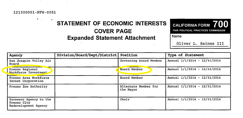 In an Oct. 14, 2014 Fresno Bee article, southwest Fresno supporters of VOICE openly expressed their concerns about the lack of training and support for unemployed disadvantaged Central Valley residents for jobs related to the California High-Speed Rail Authority; they were not looking for standards to be lowered, but instead, wanted to make sure the same opportunities were presented to their community. Candler and Reynolds presented their VOICE proposal to the The Fresno Regional Workforce Investment Board who received over a million dollars from state grant funds for pre-training efforts; however, it was not very effective in qualifying workers for apprenticeships. Baines has been a member of this board for several years, according to his California Form 700 statements one can see below: